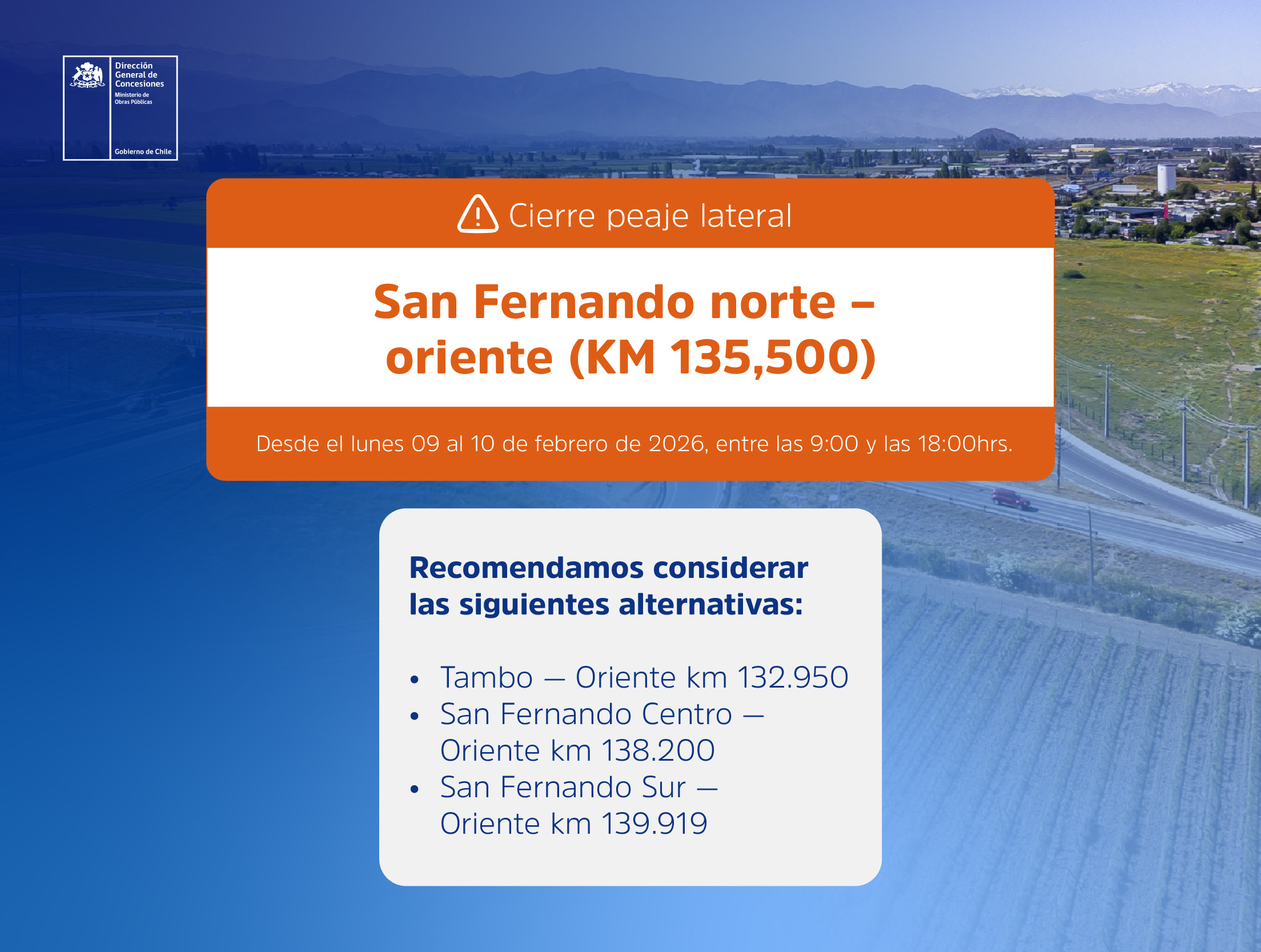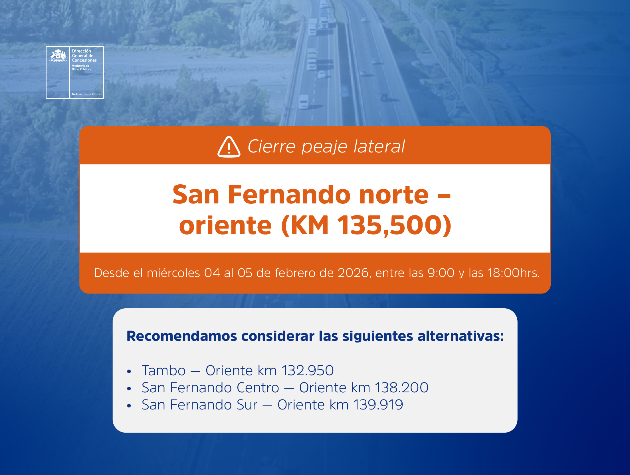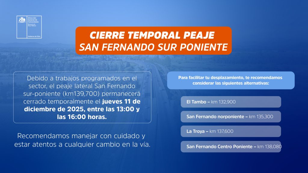 🚧⚠️ IMPORTANTE: El peaje San Fernando Sur-Poniente se encontrará cerrado temporalmente este jueves 11 de diciembre, entre 13:00 y 16:00 hrs, debido a trabajos programados en el sector. #Ruta5Sur pic.twitter.com/aeKzt2oFdA