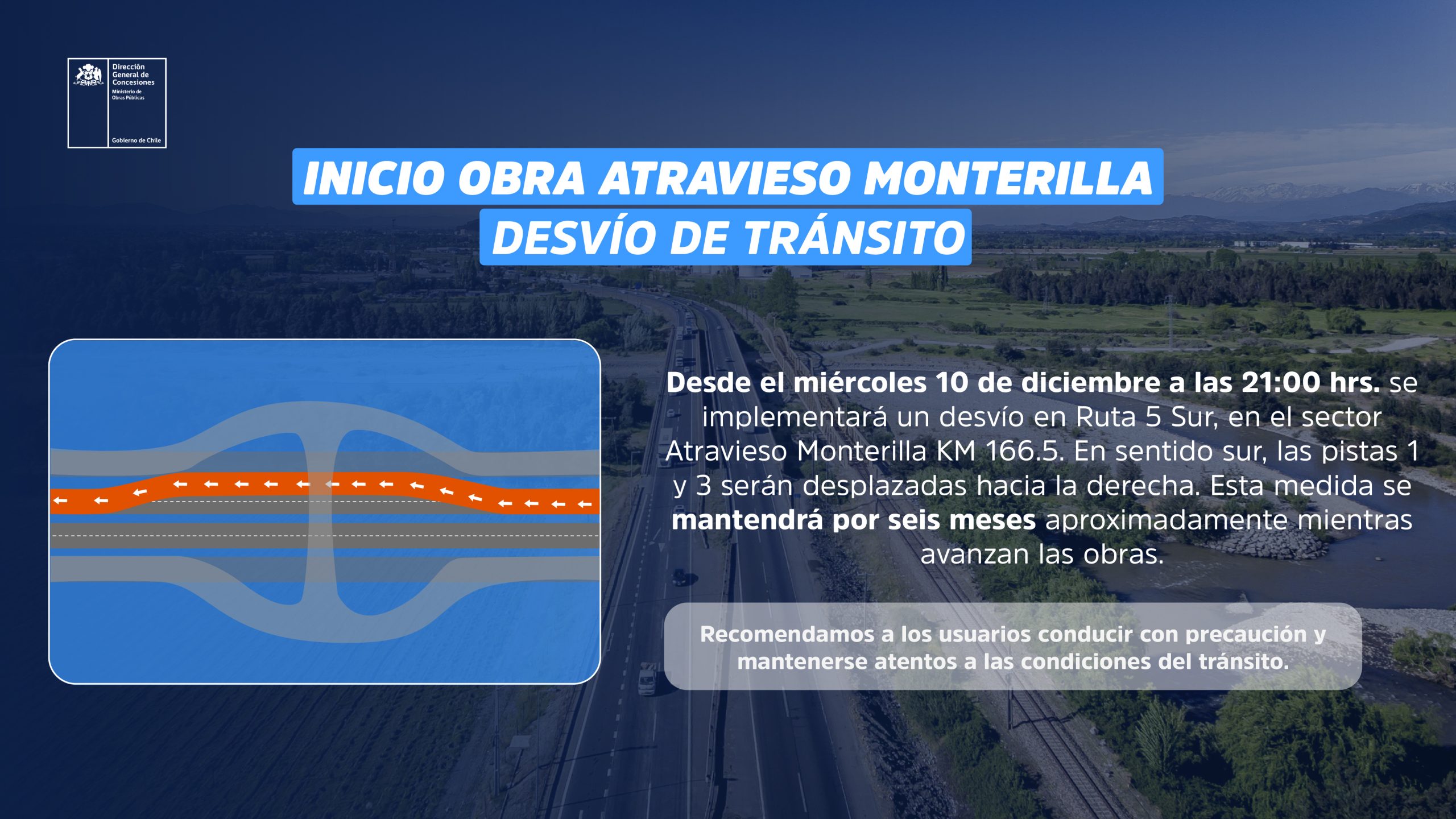 ⚠️ ¡Recuerda! Se están realizando trabajos en el Atravieso Monterilla, ubicado en el km 166,5. Conduce atento a las condiciones del lugar. #Ruta5Sur pic.twitter.com/sZ5vYNsKUW